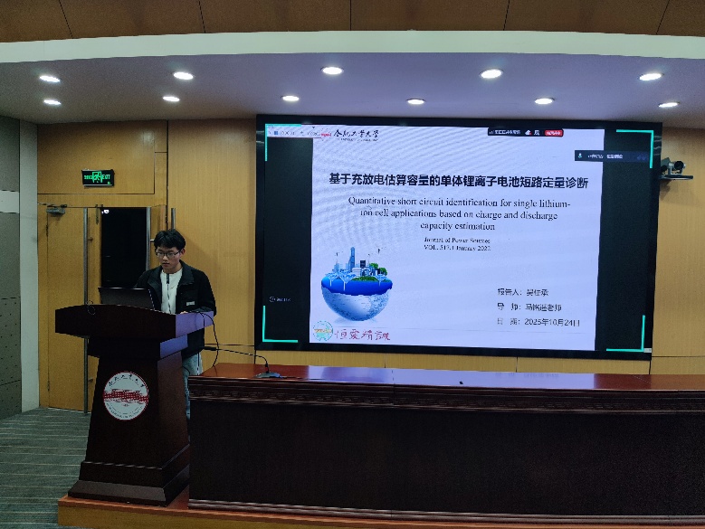 吴佳承同学分享的文献题目为“基于充放电估算容量的单体锂离子电池短路定量诊断”,微短路电池在充放电时存在容量估计的固有误差,本文提出了一种基于一阶RC等效电路模型,使用扩展卡尔曼滤波(EKF)算法高精度估计电池SOC的方法,并且采用增量SOC-容量法,分别在完整的充放电周期中估算电池容量,并且提供了充分的实验验证。