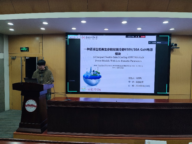 杨思哲同学分享的文献题目为“一种紧凑型低寄生参数双面冷却650V/30A GaN电源模块”,本文分析了以往文献中各种电源模块结构大多存在寄生电感较大或者热阻大的问题,并且创新性提出了一种基于GaN器件的半桥功率集成模块,采用双层DBC结构散热,有寄生电感小,散热功能好,功率密度大的优势。