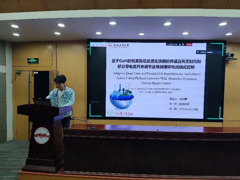 李渊博同学分享的文献题目为“基于GaN的有源箝位反激变换器的自适应死区时间和部分零电压开关调节及预测滞环电流模式控制”,现有的有源钳位反激变换器(ACF)存在传统固定死区时间控制,引发的一系列问题降低了ACF效率优势,并且固有谐振电流会增加损耗。本文建立了功率损耗模型和最优谷值电流模型,实现自适应死区与部分ZVS调节,避免了负电流损耗问题,在此基础上提出了一种基于有源钳位反激变换器的预测滞环电流模式控制策略。
