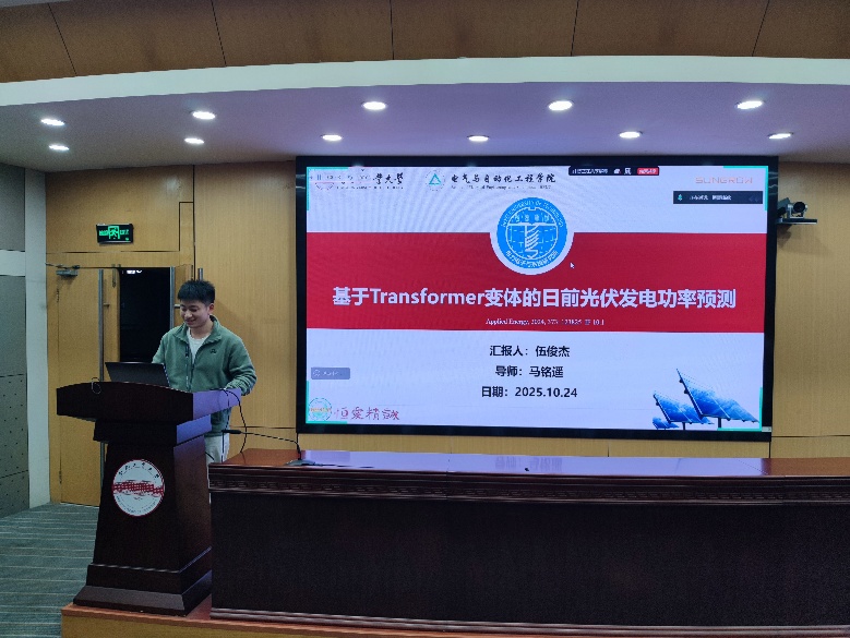 伍俊杰同学分享的文献题目为“基于Transformer变体的日前光伏发电功率预测”。随着光伏发电在电网中的渗透率越来越高,传统的建模方法没有充分利用最新的长序列预测技术。文章验证了通过结合光伏物理建模进行数据增强以提高深度学习模型性能的有效性,提出了一种基于Transformer架构的光伏功率预测新模型——PTFNet,使用并行提取数据的时序依赖和特征间依赖关系进行预测,通过后处理使预测结果契合实际应用场景需求。