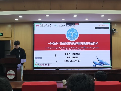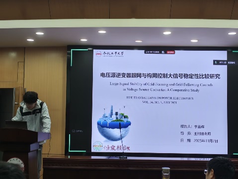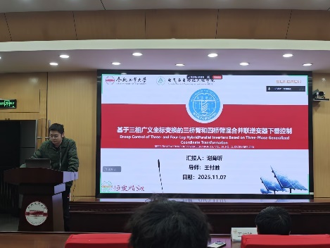 谢育昕同学分享的文献题目为“基于三线广义坐标变换的三桥臂和四桥臂混合并联逆变器下垂控制”,随着微电网系统扩容与负载增加,单台逆变器容量不足,需多台逆变器并联运行。低压微电网中线路阻抗呈阻性且