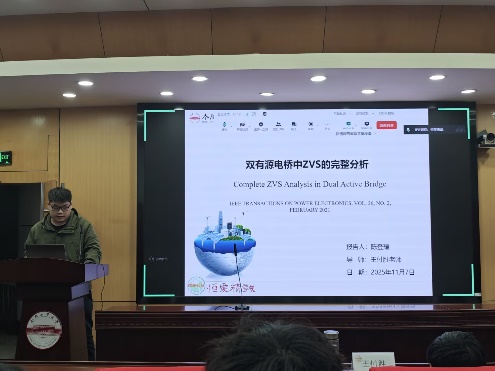 袁豪辉同学分享的文献题目为“基于时域分析的串联谐振双有源桥DC-DC变换器零回流功率控制方案”,串联谐振双有源桥变换器DBSR凭借其能量流动、软开关特性及高效率等优势,已成为储能系统等领域重要功率转换方案。但是传统基波等效法所构建的变换器模型存在精度不足等缺点,本文提出一种基于EPS控制的时域全局优化控制方法,能有效降低回流功率,并通过相角补偿降低死区间隔对开关的影响,给出了两种解决方案,并进行实验验证,分别指出了两种解决方案的优缺点。