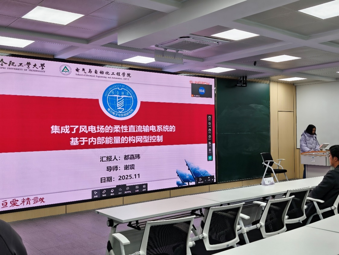 1.都嘉玮同学:《集成了风电场的柔性直流输电系统的基于内部能量的构网型控制》。探讨了将风电场通过柔性直流输电(MMC-HVDC)系统接入电网的方法,并提出了基于内部能量的构网型控制策略,以提升交直流混联系统的稳定性与可控性。汇报从MMC-HVDC的技术背景与优势展开,为后续议题奠定基础。