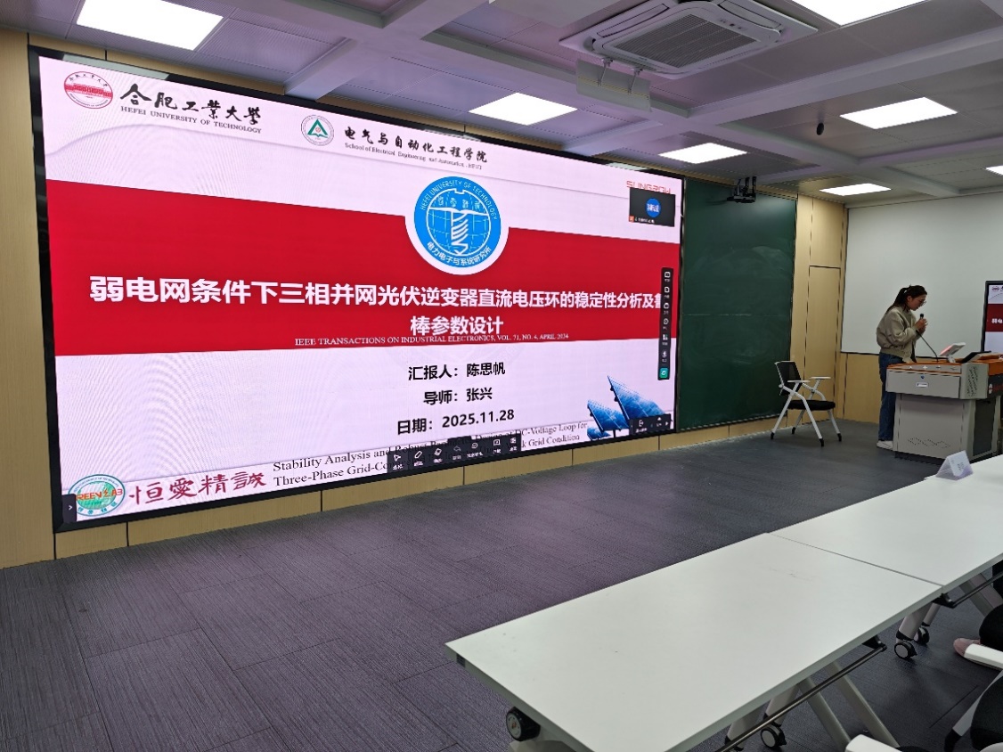 2.陈思帆同学:《弱电网条件下三相并网光伏逆变器直流电压环的稳定性分析及鲁棒参数设计》。针对弱电网场景,深入分析了对光伏逆变器直流电压环的稳定性影响机理,并提出了鲁棒参数设计方法,以增强逆变器在复杂电网环境下的运行可靠性。