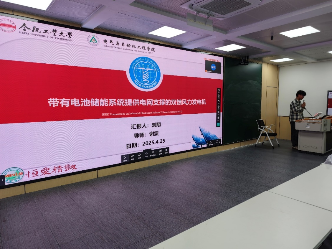 3.刘翔同学:《带有电池储能系统提供电网支撑的双馈风力发电机》。探讨了一种将电池储能系统与双馈风力发电机结合,以提供惯性支持和频率调节等电网服务的新方案,并且重点分析了该混合系统的控制架构与支撑能力。