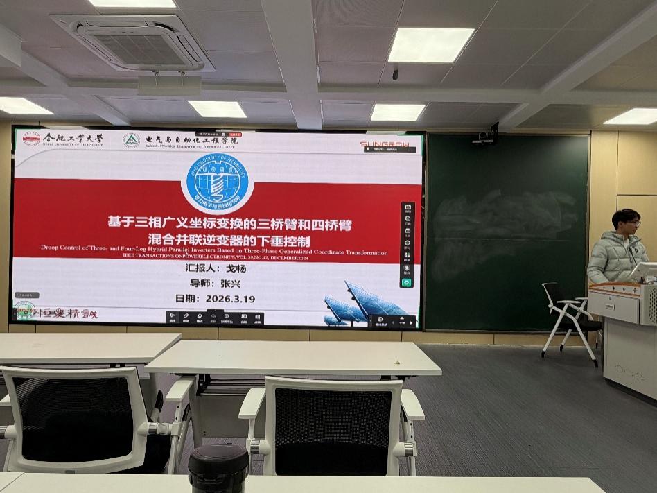 戈畅同学分享的文献题目为“基于三相广义坐标变换的三桥臂和四桥臂混合并联逆变器的下垂控制”,文章聚焦于微电网在三相负载不对称工况下的功率均分与电压稳定问题。引入了三相广义坐标变换方法,将不平衡信号直接映射为直流分量进行处理。技术手段上,采用二阶广义积分器陷波器滤除瞬时功率中的二次谐波脉动,并改进了虚拟阻抗控制,使逆变器输出电压能够无静差地跟踪下垂控制指令。这一方案不仅简化了控制架构,还显著提升了多台逆变器在不平衡负载下的功率分配精度和动态稳定性,增强了微电网的鲁棒性。