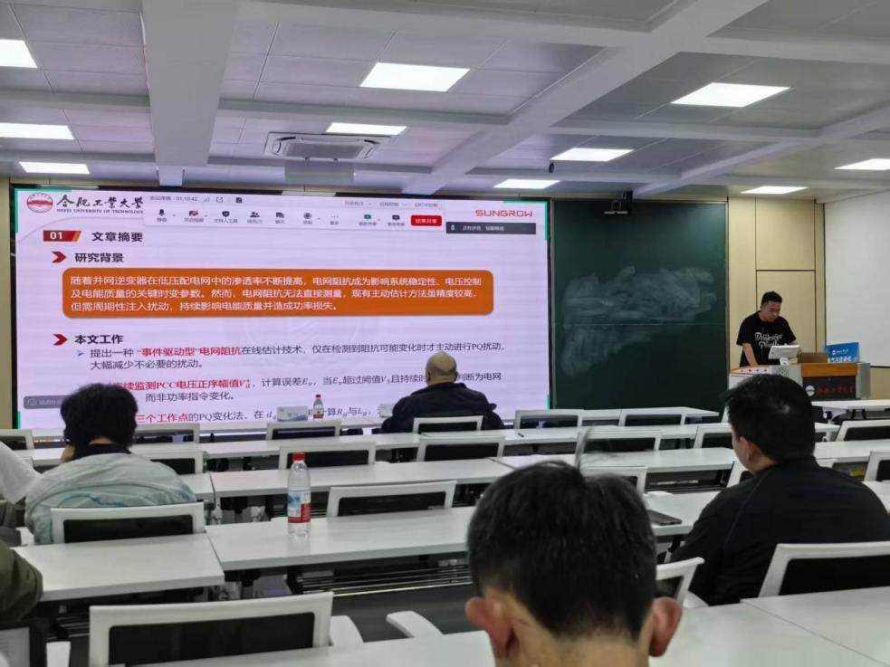 张瑞同学汇报的题目是《一种基于并网逆变器的在线事件触发式电网阻抗估计技术》,该文献围绕电网阻抗在线估计问题提出了一种事件触发式方法,传统阻抗估计多采用周期性测量或持续扰动方式,容易带来额外损耗及电能质量影响。报告介绍了通过设置触发条件,在电网状态发生变化时才进行阻抗估计的思路,从而减少不必要的测量与扰动。该方法在保证估计精度的同时,有效降低了计算与控制开销,提高了系统运行效率。